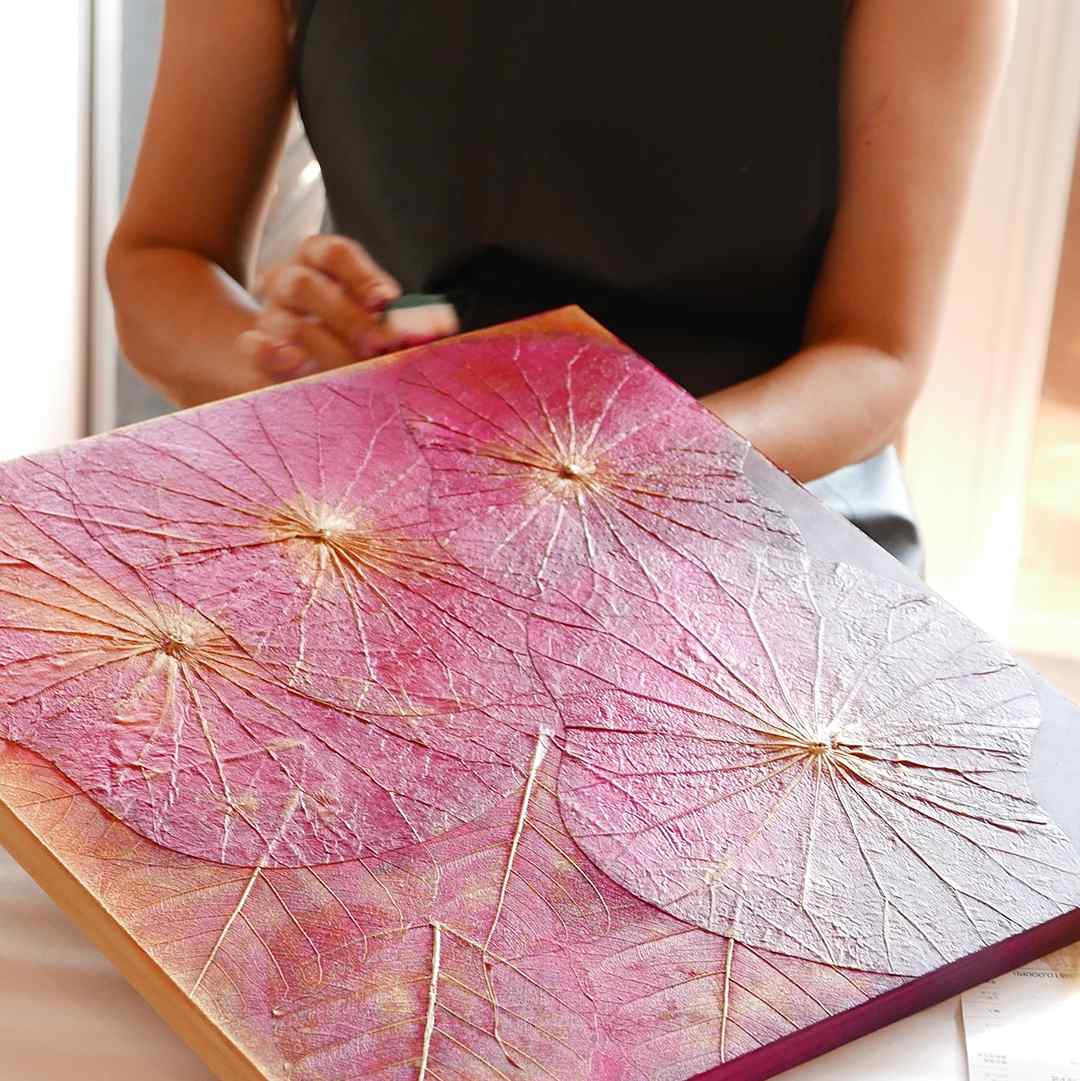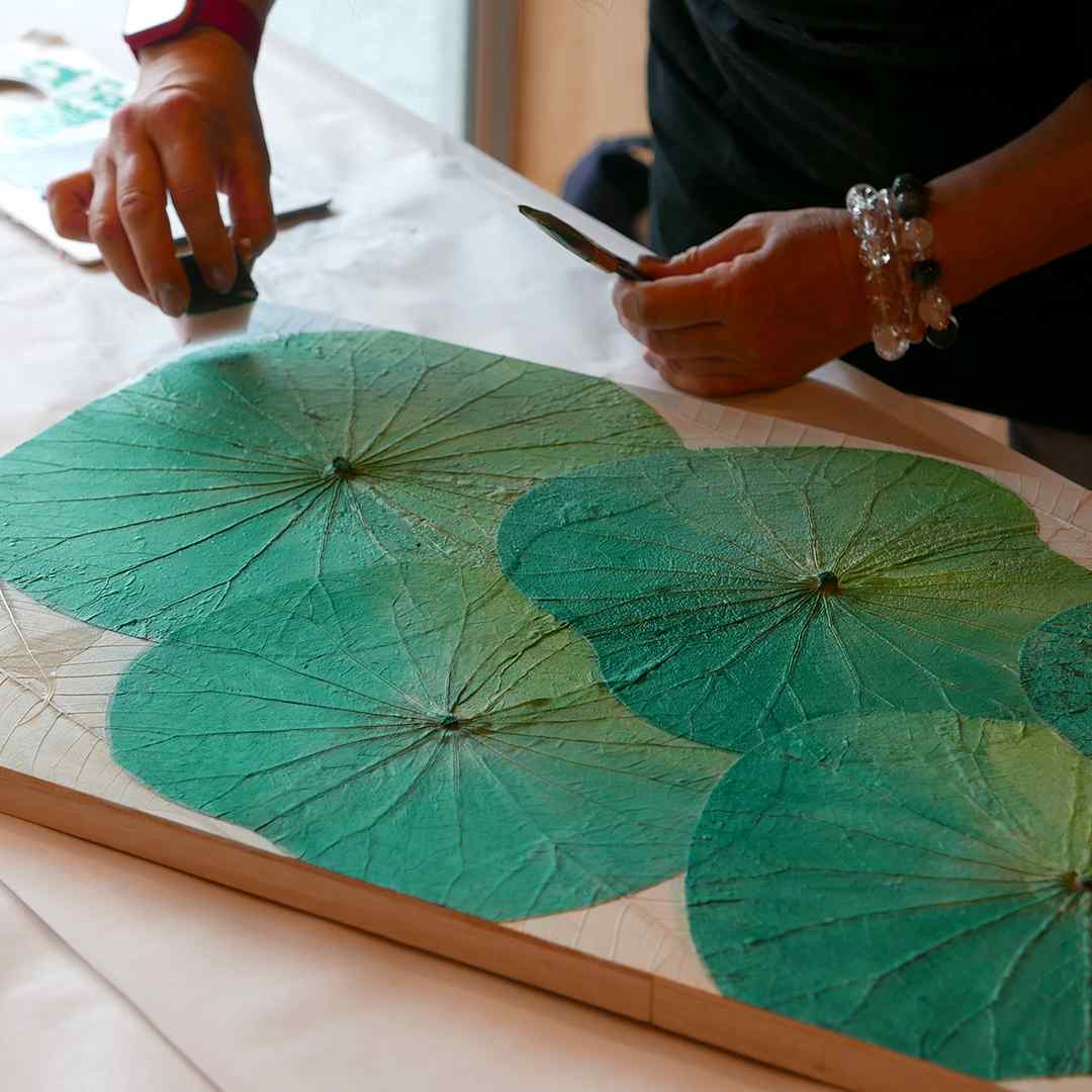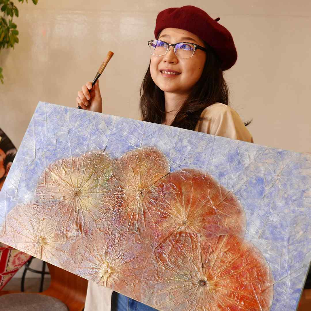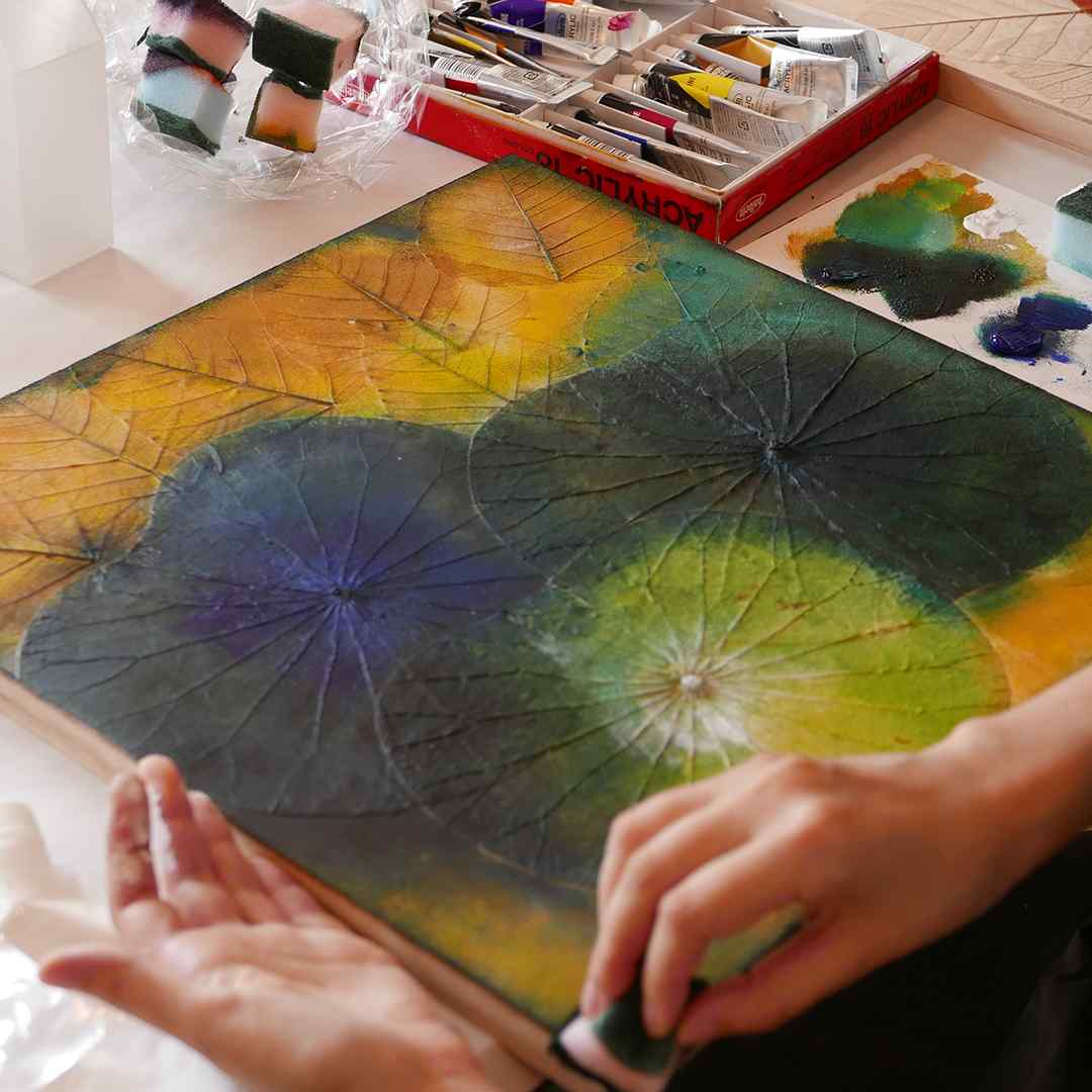 菩提樹は、学びや気づきの象徴として古くから親しまれてきた木です。その葉の繊細な葉脈に、植物への敬意と、アートをはじめる喜びを重ねました。